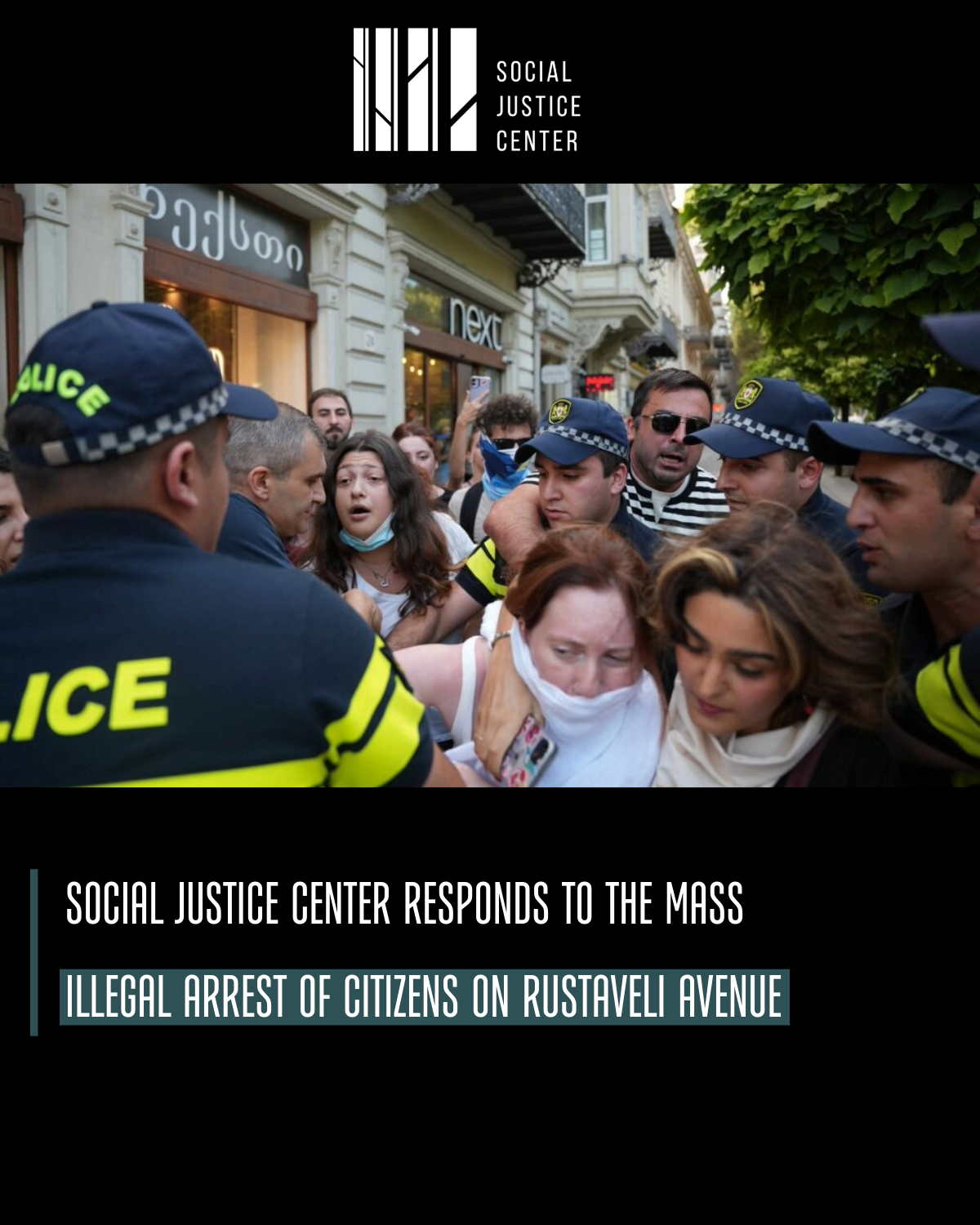 Following the announcement of guilty verdicts by the Tbilisi City Court against prisoners of conscience, citizens gathered near the Parliament building to protest the report of a temporary investigative commission with a controversial mandate, studying the activities of the "National Movement". The police officers mobilized at the scene did not allow part of the citizens to express their protest and detained them using force. Publicly available video footage confirms that the demonstrators were placed into police vehicles without any prior explanation. At the moment of detention, part of the detained citizens were not occupying the roadway.