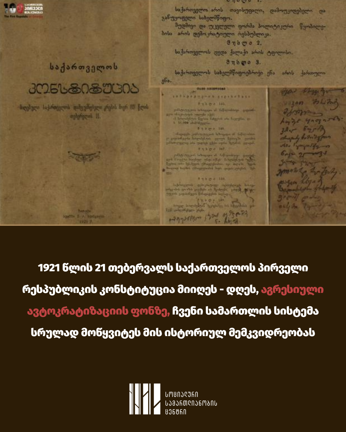 იმ პირობებში, როდესაც საკანონმდებლო ძალაუფლება ავტოკრატიული წესრიგის გამყარების ინსტრუმენტად იქცევა, განსაკუთრებით მნიშვნელოვანია 1921 წლის კონსტიტუციასთან მიბრუნება და მის ღირებულებებზე რეფლექსია, რათა შესაძლებელი გახდეს ქვეყნის დემოკრატიზაციის სამომავლო პროექტის წარმოდგენა: იმგვარი სისტემისა და საზოგადოებრივი შეთანხმების შექმნა, რომელიც პატივს სცემს ადამიანის წარუვალ უფლებებს, თავისუფლებებს, სოციალურ თანასწორობასა და სოლიდარობაზე დაფუძნებულ, სამართლიან, დემოკრატიულ და ინკლუზიურ საზოგადოებას შექმნის.