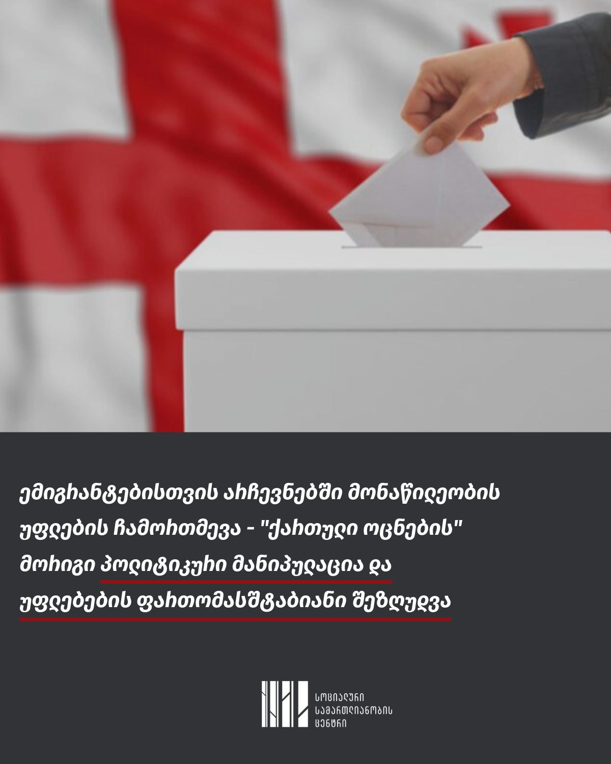 სოციალური სამართლიანობის ცენტრის შეფასებით, აღნიშნული საკანონმდებლო ინიციატივა ერთ-ერთი უმძიმესი ნაბიჯია საქართველოს დემოკრატიული უკუსვლისა და ქვეყანაში ავტორიტარიზმის კონსოლიდაციის პროცესში, რომელიც კონსტიტუციისა და ადამიანის უფლებათა საერთაშორისო სტანდარტების საწინააღმდეგოდ და „ქართული ოცნების“ კონსპირაციული და ანტიდასავლური პროპაგანდისტული ნარატივების საფუძველზე, ფაქტობრივად, აუქმებს უცხოეთში მცხოვრები საქართველოს მოქალაქეების მიერ აქტიური საარჩევნო უფლებით სარგებლობას. ეს ინიციატივა უარყოფს ემიგრაციაში მყოფი ჩვენი მოქალაქეების უმნიშვნელოვანეს ჩართულობას საქართველოს პოლიტიკურ და ეკონომიკურ ცხოვრებაში და კიდევ ერთ უმძიმეს დარტყმას აყენებს ქვეყნის დემოკრატიულ მომავალს.