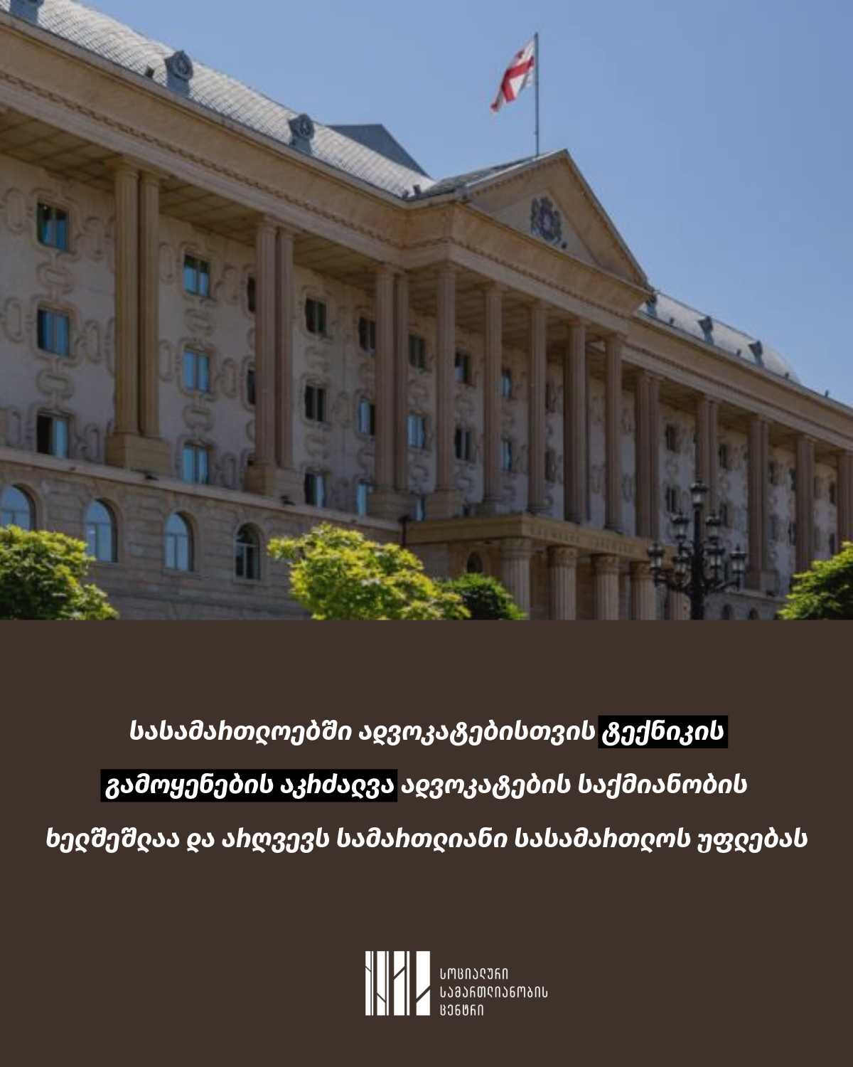 სოციალური სამართლიანობის ცენტრის შეფასებით, სასამართლო პროცესზე ადვოკატების საქმიანობაში ამგვარი ჩარევა ლახავს კონსტიტუციითა და ადამიანის უფლებათა სამართლით დადგენილ დაცვის მხარის სამართლიანი სასამართლოს, ისევე როგორც ადვოკატთა მიერ თავიანთი საქმიანობის შეუფერხებლად განხორციელების გარანტიებს. მართლმსაჯულების სათანადოდ განხორციელების უზრუნველყოფად ვერ შეფასდება ადვოკატების შეზღუდვა, სრულფასოვნად დაიცვან საკუთარი დაცვის ქვეშ მყოფი ინდივიდები და ამ მიზნით პროცესზე გამოიყენონ საჭირო დამხმარე ტექნიკური საშუალებები. სასამართლო პროცესების სრულად გასაიდუმლოების ასეთი მონდომებული მცდელობა არა მართლმსაჯულების განხორციელების ეფექტიანობას, არამედ დაცვის მხარისა და ადვოკატების უფლებების უგულებელყოფის ხარჯზე, საზოგადოების სამართლიანი და მწვავე კრიტიკისგან იმ მოსამართლეთა კომფორტის დაცვას ემსახურება, რომლებიც პოლიტიკური პატიმრებისა და გამოხატვის თავისუფლებით სარგებლობისათვის უსამართლოდ დაკავებული მოქალაქეების საქმეებს იხილავენ.