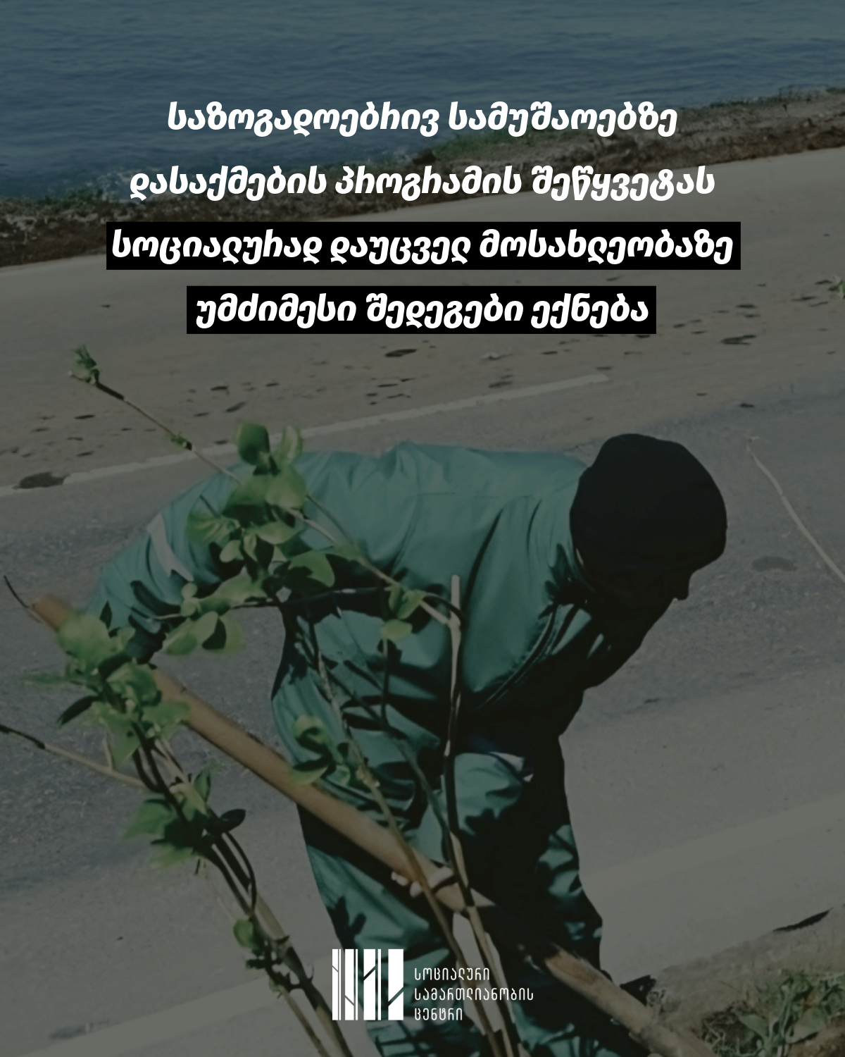 19 დეკემბერს გამოქვეყნდა საქართველოს 2026 წლის სახელმწიფო ბიუჯეტის საბოლოო, დამტკიცებული ვერსია, რომლითაც გათვალისწინებული აღარაა საზოგადოებრივ სამუშაოებზე დასაქმების ქვეპროგრამა. მიგვაჩნია, რომ ქვეყნის მოსახლეობის საჭიროებებისა და უკიდურესი სოციალურ-ეკონომიკური მოწყვლადობის გათვალისწინებით, ალტერნატივის გარეშე, სიღარიბეში მცხოვრები ადამიანებისათვის სერვისის გაუქმება წარმოადგენს მათი სოციალური უფლებების გაუარესებას და უმძიმესად აისახება ათასობით ოჯახის ეკონომიკურ მდგომარეობაზე.