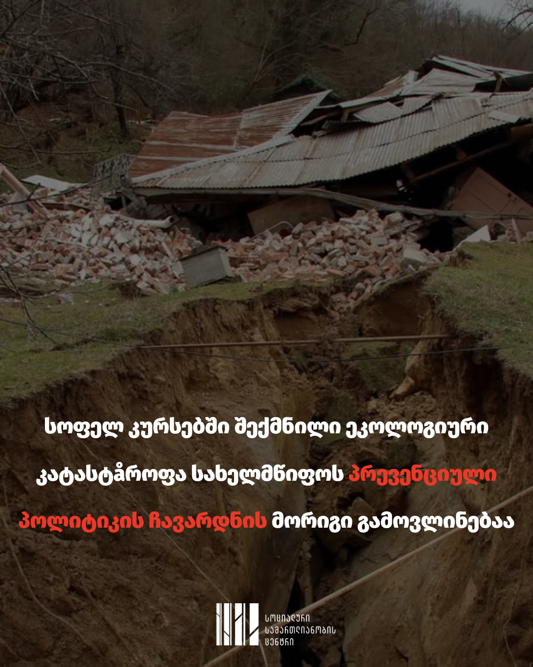 სოციალური სამართლიანობის ცენტრი ტყიბულის მუნიციპალიტეტის სოფელ კურსებში შექმნილ ეკოლოგიურ კატასტროფას ეხმაურება. მიგვაჩნია, რომ ეს შემთხვევა სახელმწიფოს პრევენციული პოლიტიკის ჩავარდნის ერთ-ერთ ნათელ გამოხატულებას წარმოადგენს. ამ კონტექსტში არსებითია, რომ უმოკლეს ვადებში მოხდეს, ერთი მხრივ, მოსახლეობის სიცოცხლისა და ჯანმრთელობის დაცვა, ხოლო, მეორე მხრივ, ამ ადამიანების ღირსეული გრძელვადიანი საცხოვრებლით უზრუნველყოფა.