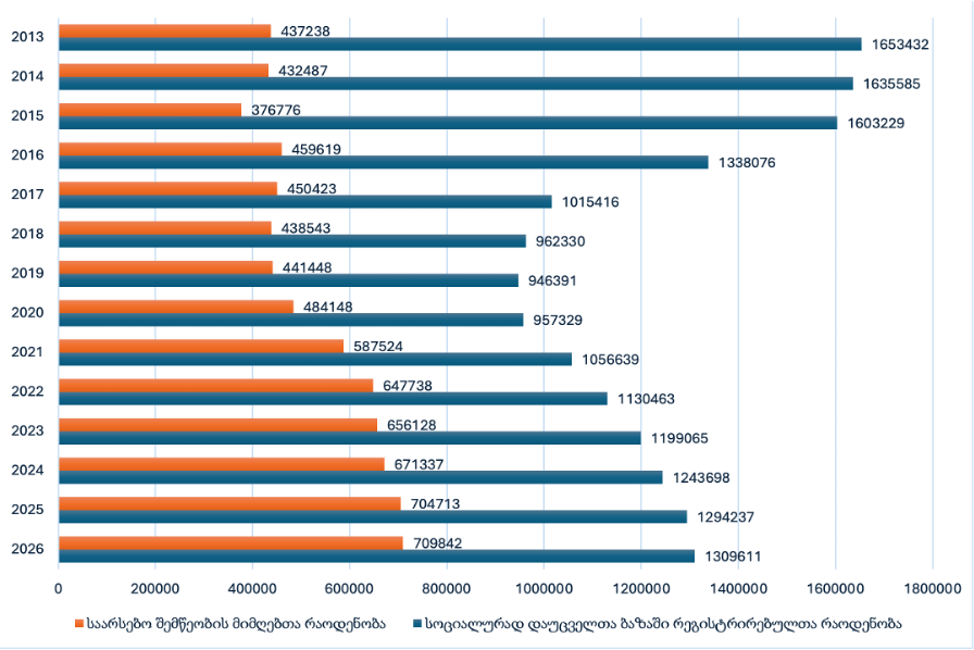 დიაგრამა N2. სოციალურად დაუცველთა ბაზაში რეგისტრირებული და საარსებო შემწეობის მიმღები ადამიანების რაოდენობა (2013-2026 წწ)