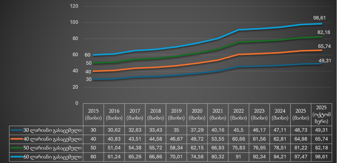 სტატისტიკის ეროვნული სამსახურის სამომხმარებლო ფასების ინდექსის თანახმად, 2013 წლის ივლისის მდგომარეობით, 60 ლარის სამომხმარებლო ღირებულება 2025 წლის ოქტომბრისთვის 106 ლარს შეადგენდა. ამასთან, 2025 წლის ოქტომბრის მდგომარეობით 60 ლარის სამომხმარებლო ღირებულება 2013 წლის ივლისისთვის მხოლოდ 33.79 ლარის ტოლი იყო. შესაბამისად, მიუხედავად სოციალურ დაცვაზე ბიუჯეტის ყოველწლიური ზრდისა, ინდივიდუალურ დონეზე საარსებო შემწეობის რეალური ოდენობა არა თუ არ გაიზარდა, არამედ მნიშვნელოვნად შემცირდა კიდეც.