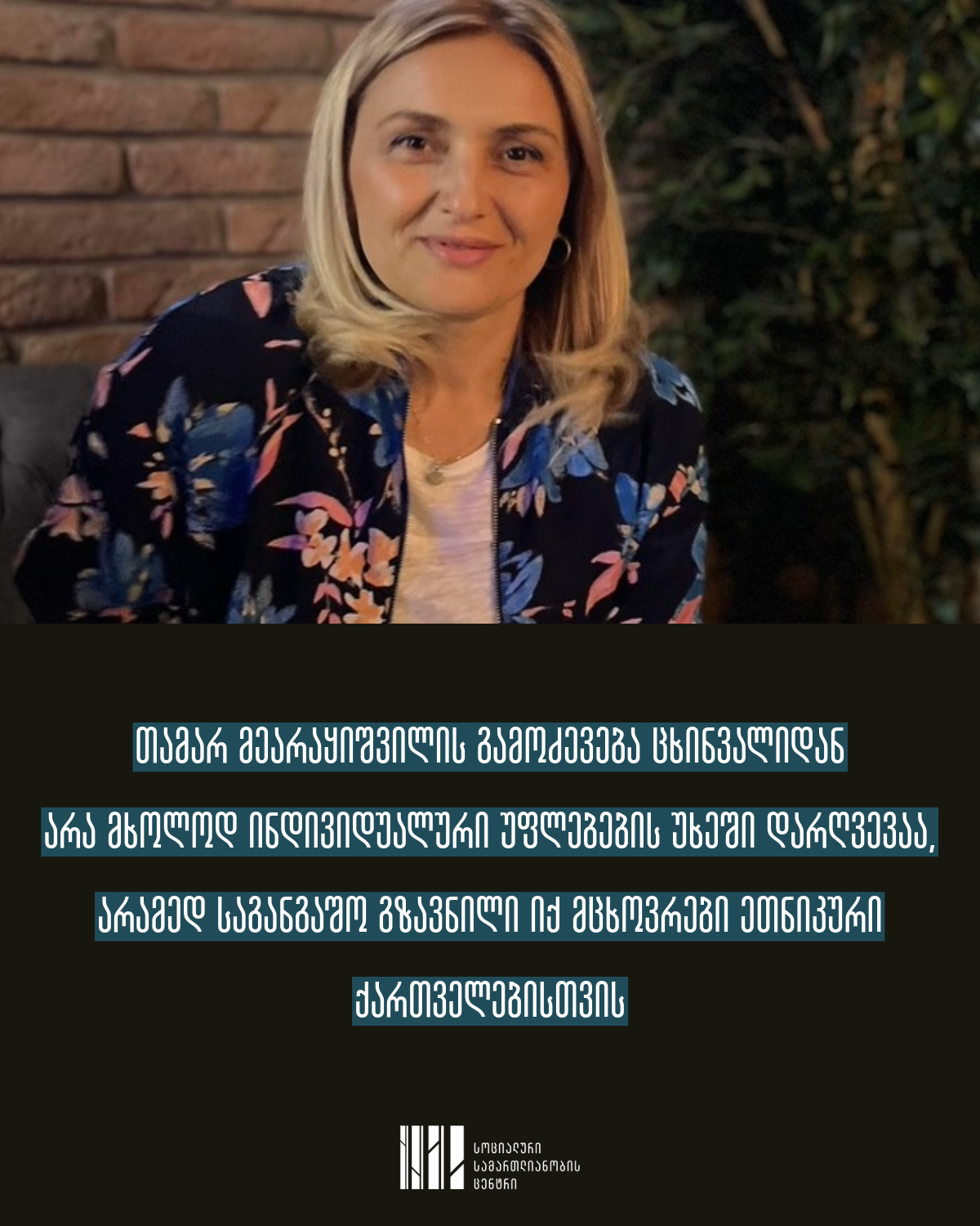 სოციალური სამართლიანობის ცენტრი აფასებს ცხინვალიდან თამარ მეარაყიშვილის გამოძევების საქმეს და მიიჩნევს, რომ აღნიშნული გადაწყვეტილებით უხეშად დაირღვა არა მხოლოდ ქართველი აქტივისტი ქალის უფლებები,არამედ რეგიონში მცხოვრები ეთნიკურად ქართველი მოსახლეობის სამართლებრივი სტატუსი გახდა სადავო.