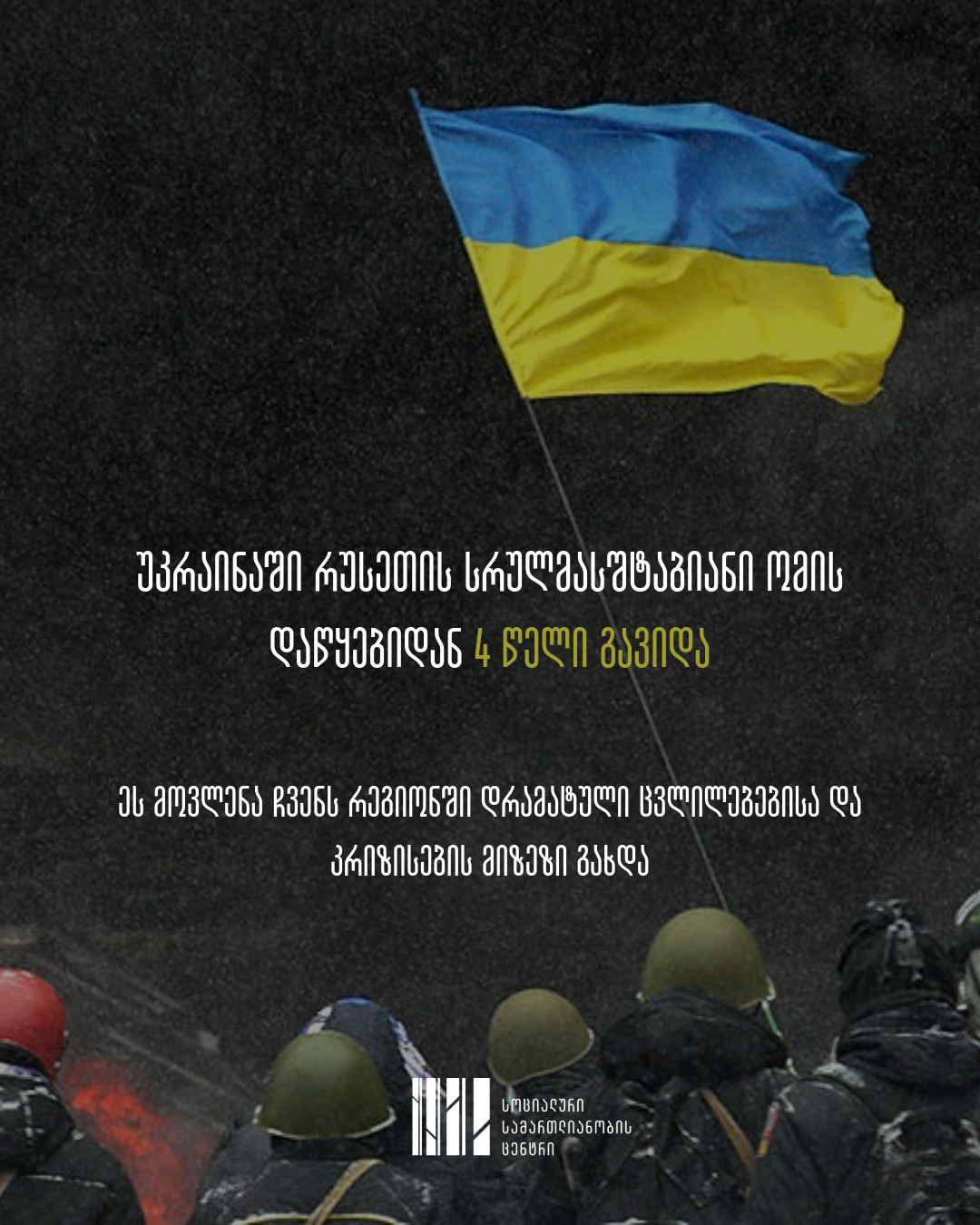 დღეს, 2026 წლის 24 თებერვალს, რუსეთის უკრაინაში სრულმასშტაბიანი შეჭრიდან 4 წელი შესრულდა. რუსეთის ამ იმპერიალისტური და უკანონო აგრესიის შედეგად, ბოლო 4 წლის განმავლობაში დაიღუპა და დაიჭრა ასობით ათასი უკრაინელი ჯარისკაცი (მათ შორის უკრაინის დაცვას შეეწირა 100-ზე მეტი ქართველი მოხალისე) და სულ მცირე 55 660 მშვიდობიანი მოქალაქე (14 999 მოკლული, 40 601 დაჭრილი)[1], ხოლო დაახლოებით 6 მილიონი უკრაინელი იძულებული გახდა დაეტოვებინა საკუთარი ქვეყანა[2], ამათგან 29 230 უკრაინელი ლტოლვილი საქართველოში აფარებს თავს.[3] თავის მხრივ, ქვეყნის შიგნით ომის შედეგად იძულებით გადაადგილებულია დაახლოებით 3.8 მილიონი უკრაინელი.[4] აღსანიშნავია, რომ ომის შედეგად გამოწვეული ინფრასტრუქტურული და ეკონომიკური ტიპის დესტრუქციაც, რაც უკრაინელი საზოგადოების კეთილდღეობაზე დამატებით და განგრძობად უარყოფით გავლენას ახდენს.