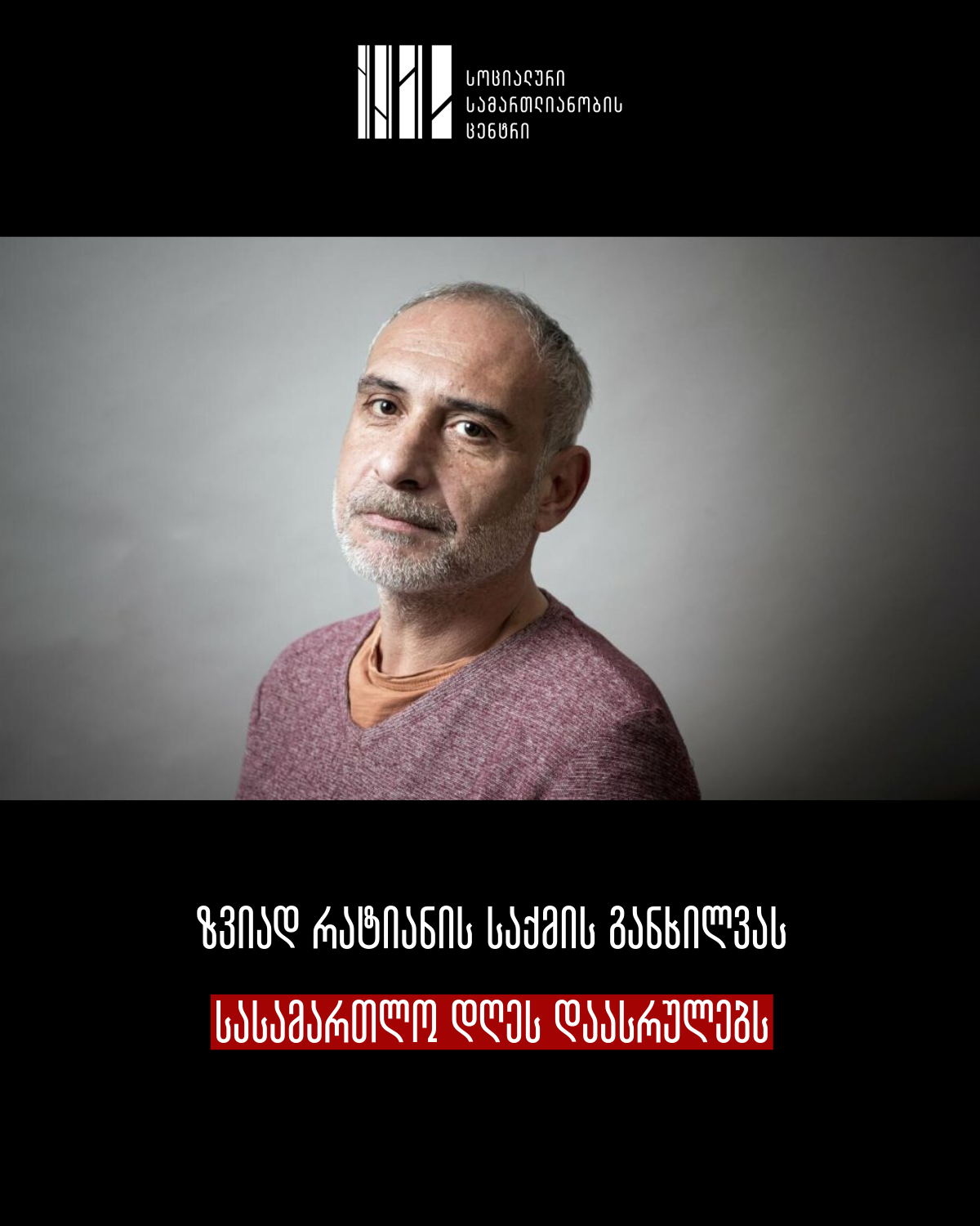 სოციალური სამართლიანობის ცენტრი აგრძელებს ზვიად რატიანის ინტერესების დაცვას. სასამართლო განხილვის მიმდინარეობის შესახებ საზოგადოებას პერიოდულად მივაწვდით განახლებულ ინფორმაციას.