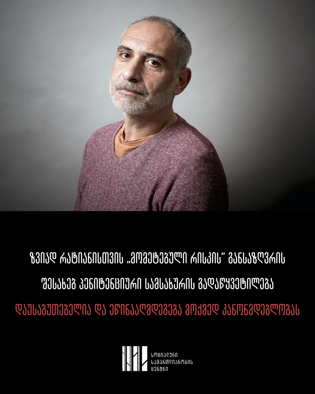 სოციალური სამართლიანობის ცენტრი ეხმაურება ზვიად რატიანისთვის სასჯელის მოხდისას საშიშროების რისკის ცვლილებას და მიგვაჩნია, რომ პენიტენციური სამსახურის აღნიშნული გადაწყვეტილება არსებითად დაუსაბუთებელია და არ აკმაყოფილებს კანონმდებლობით დადგენილ მოთხოვნებს.